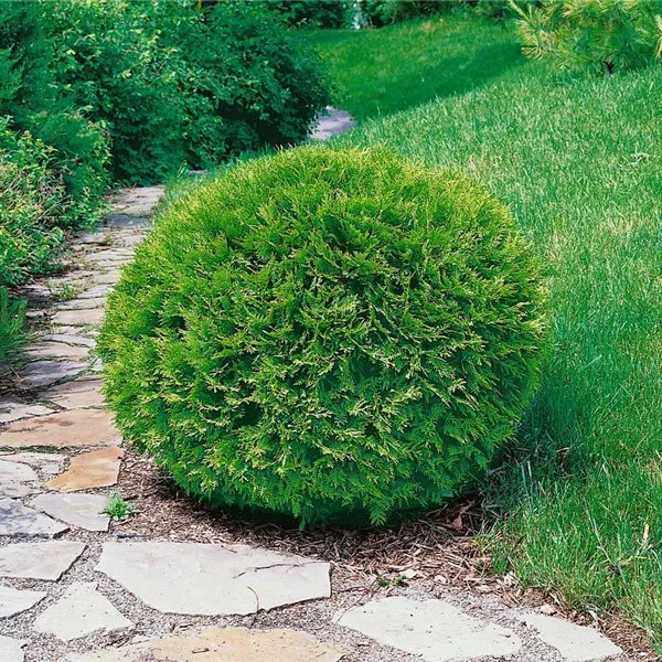 Туя западная Recurvata Nana - хвойный вечнозеленый кустарник. Крона шаровидная, густая, плотная. Прирост за год медленный - 5 см в высоту и 5 см в ширину. Высота кроны 2 м, а диаметр 2 м. Хвоя матово-зелёная, зимой слегка буреющая. Светолюбива, выносит полутень. Предпочитает влажные и плодородные почвы. Весной необходимо удалять высохшие побеги, стрижка умеренная. Требуется защита от весеннего солнца. Хорошо смотрятся в аллейных посадках, в качестве живой изгороди, на каменистых террасах, в композициях с лиственными и хвойными деревьями и кустарниками.