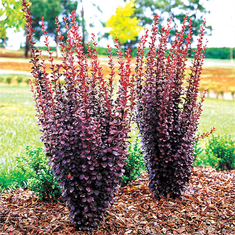 Барбарис Тунберга «Red Pillar» - декоративный кустарник высотой до 1.5 метров, с колоновидной, густой формой. Листья пурпурно-красного цвета, а внутри более темные, с бледно-зеленым оттенком. В осенний сезон окрас листьев барбариса становится ярко-красными. Окрас листьев зависит от местоположения, солнце, полутень. Рекомендуется сажать барбарис только на солнечные участки. Цветение на конец мая – начало июня. Цветочки одиночные в небольшие кисти желтой окраски. Прекрасно подходит для создания низких изгородей.