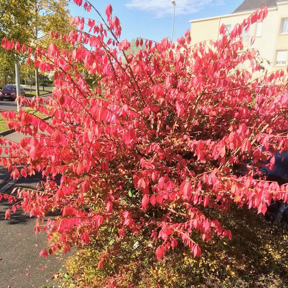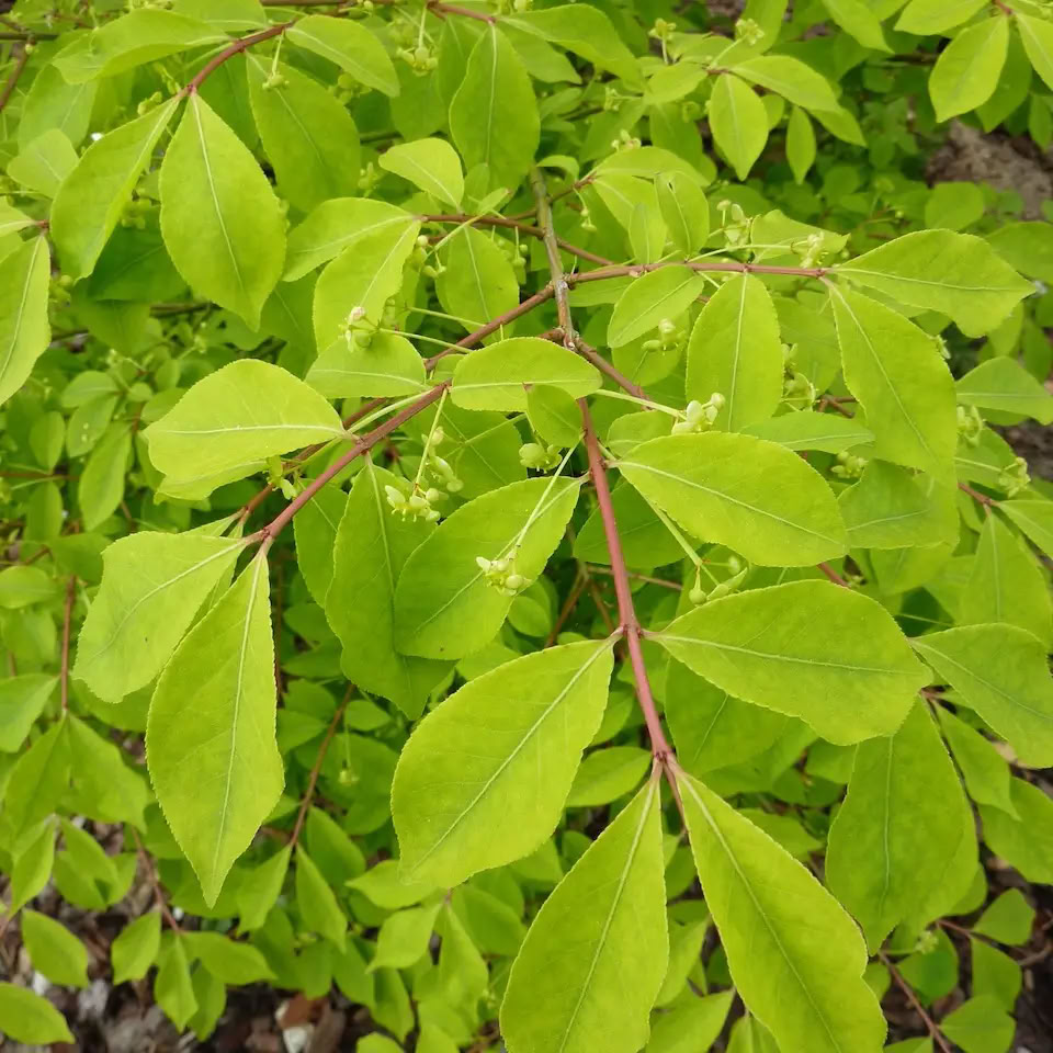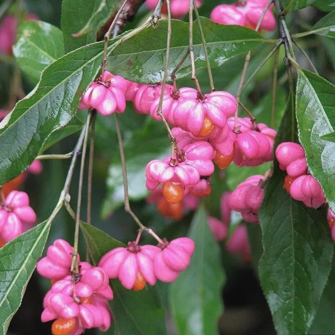 Бересклет крылатый — растет в виде раскидистого кустарника. Высота взрослого растения достигает 2-х метров. Ежегодный прирост составляет примерно 15 см. Кора зеленая, побеги ребристые, некоторые - с широкими пробковыми наростами. Листья широко-овальные, темно-зеленые, кожистые, осенняя окраска карминно-красная или насыщенно-розовая. Цветки зеленовато-желтые, мало примечательные. Цветет в мае – июне. Плоды четырехлопастные красно-оранжевые коробочки. Светолюбивое растение, яркость осенней окраски зависит от освещенности и нейтральности почвы. Посадка на освещенных местах с плодородными, дренированными почвами. Иногда повреждается тлей. Для профилактики куст следует обработать инсектицидом. Зимостойкость высокая, в сильные морозы могут повреждаться концы побегов.