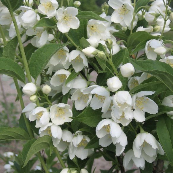 Чубушник «Воздушный Десант» — изящный кустарник с вертикальными побегами, формирующими плотную пирамидальную крону. Весной ветви покрываются гроздьями поникших белых цветов с тонким фруктовым ароматом, создавая эффект лёгких воздушных «парашютов». Высота 2–2,5 м, ширина кроны около 1,5–2 м. Листья средние, светло-зелёные, декоративны даже после цветения.