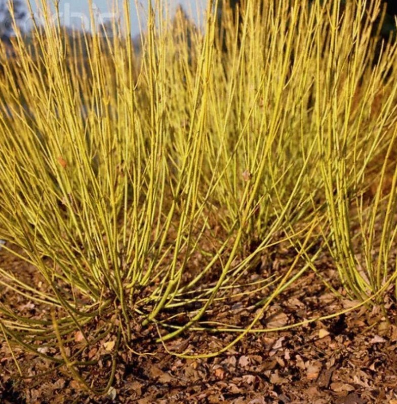 Дёрен отпрысковый — энергичный листопадный кустарник, оживляющий сад своими яркими побегами и плотной зелёной кроной. Куст занимает 2–3 м в высоту и ширину, быстро разрастаясь за счёт корневой поросли. Зимой и ранней весной побеги светло‑зелёные с тёплым жёлтым оттенком, летом густо покрываются зелёной листвой, а осенью окрашиваются в мягкие красновато‑оранжевые тона, создавая живописный контраст. Мелкие желтовато-белые цветки и декоративные белые плоды завершают выразительный образ.