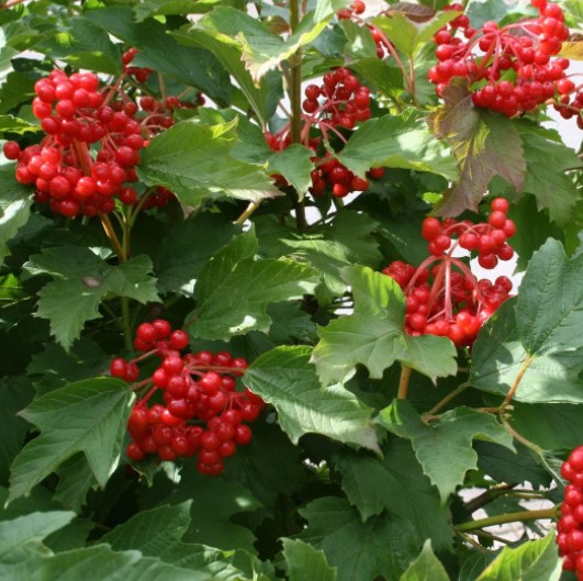 Калина обыкновенная - высота до 3,5м, цветет в мае-июне красивыми белыми соцветиями, собранными в плоские щитки диаметром 2-12 см. Листья калины среднего размера, в длину и ширину примерно одинаковые – 6-10 см. Плоды – съедобные красные ягоды-костянки овальной или круглой формы, в диаметре примерно 6-10 мм. Созревают в конце августа – сентябре.При сборе урожая в более позднее время (при минусовой температуре) горький привкус становится меньше. Ягоды ценятся не за вкус, а за хороший витаминный состав. В условиях сада калину выращивают как декоративное и целебное растение. В лечебных целях успешно применяют все части растения (отвары и настои коры, листьев, ягод), которые помогают справиться с различными недугами. Кустарник, способный стать ярким украшением любого сада.