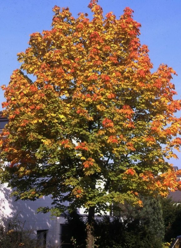 Клен остролистный — декоративное дерево с плотной и раскидистой кроной. Летом листья насыщенно-зелёные, глубоко лопастные, осенью приобретают тёплые жёлтые и оранжевые тона, создавая живописную осеннюю палитру. Взрослое дерево достигает 12–20 м в высоту, ширина кроны составляет 8–15 м, формируя эффектный зелёный шатёр в саду.