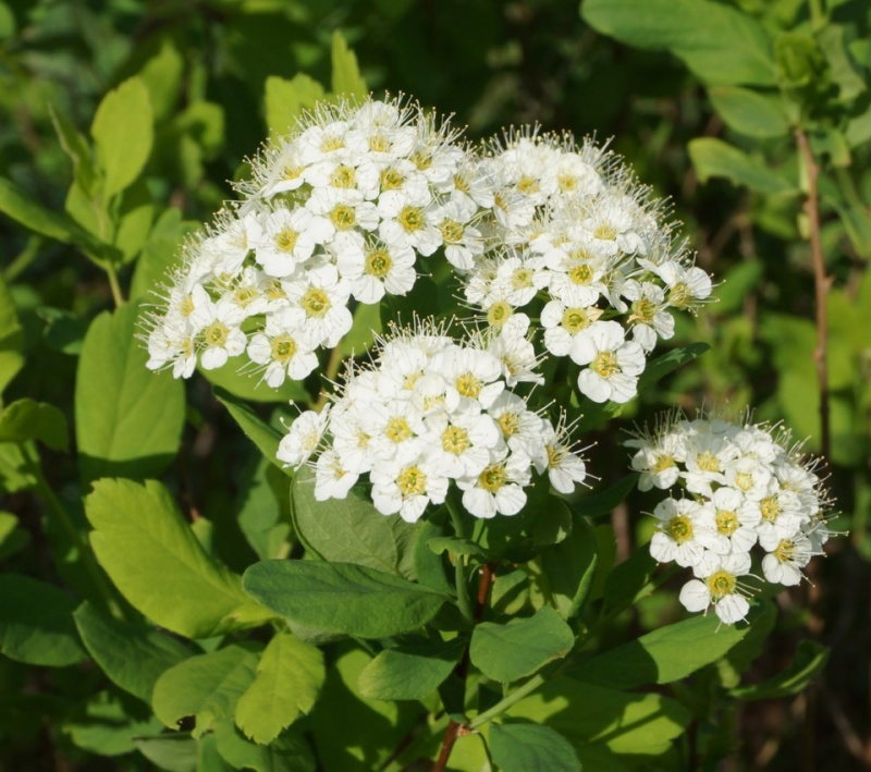 Спирея дубравколистная - кустарник листопадный высотой до 2.0 м., с плотной, округлой формой. Листья острозубчатые по краю, ярко-зеленые. Цветки белые, собраны в шаровидные соцветия. Цветет обильно в конце мая, 4 недели. Декоративна листвой, дает много поросли соединяющей листву в густые заросли. К плодородию и влажности почв малотребовательна. Светолюбива, зимостойкая. Куст отлично смотрится на фоне лиственных и хвойных деревьев. С помощью спиреи можно создать пышную белоснежную живую изгородь, отлично смотрится в одиночных посадках.