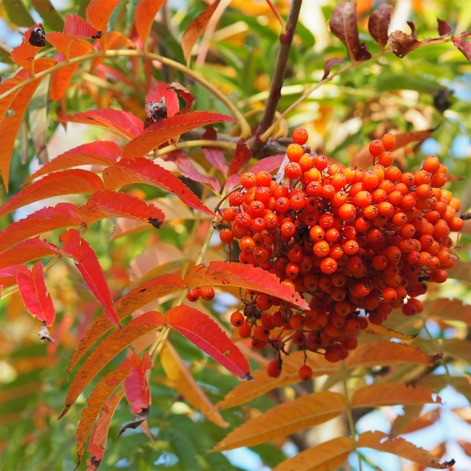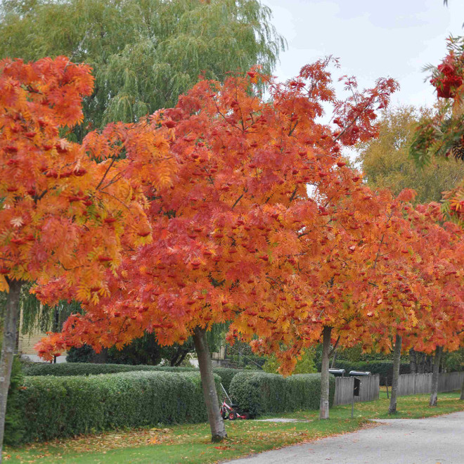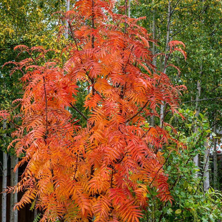 Рябина Додонг - дерево высотой до 8 м., компактное, с колоновидной формой кроны. Листья темно-зеленые, крупные, длиной до 30 см, непарноперистые, состоят из 12-15 мелких, ланцетовидных листиков, что придает дереву ажурность и необычный, "тропически" вид, осенью оранжевая. Цветет в конце мая, белыми соцветиями. Плоды крупные оранжево-красные, грушевидной формы. Рябина является светолюбивой, но может вырастать и в полутени. Для посадки лучше использовать плодородные, увлажненные суглинистые почвы. Чтобы достичь наивысшей декоративности растения и получить яркий оттенок листьев следует производить высадку на солнечных местах.