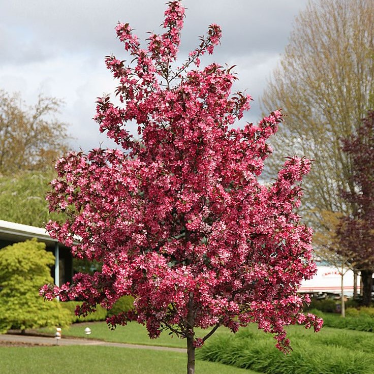 Яблоня декоративная «Royalty» - плодово-декоративная яблоня высотой до 5.0 метров. Листья плотные, красно-фиолетового цвета. Цветет багряным цветом, май-июнь, цветение можно сравнить с японской сакурой. Яблоню сажают не ради вкусных плодов, а исключительно ради пышного цвета и красивого внешнего вида. Хорошо себя чувствует на суглинистых, в меру влажных, песчаных почвах. Предпочитает солнце, полутень. Используется для оформления живых изгородей, парковых аллей, создания групповых и одиночных посадок.