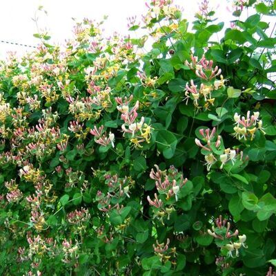 Жимолость каприфоль — изящная вьющаяся лиана с ароматными розово-кремовыми цветами, украшающими сад с конца весны до середины лета. Её побеги достигают длины 3–5 метров, образуя густую зелёную стену, эффектно смотрящуюся на арках, перголах и заборах. Листья крупные, овальные, летом насыщенно-зелёные, а к осени приобретают золотистые оттенки.