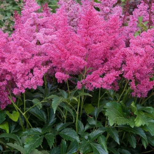Астильба арендса ‘Astary Rose’ — многолетнее растение с густыми перистыми листьями и высокими соцветиями насыщенного розового цвета. Цветение обильное, начинается в июне и продолжается 4–6 недель, создавая яркий акцент в тенистых уголках сада.