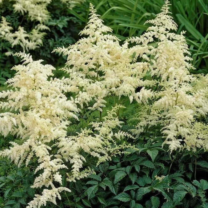 Астильба Brautschleier идеально подходит для клумб, бордюров, миксбордеров и тенистых уголков сада, создавая воздушные белые акценты и изысканную декоративную композицию.