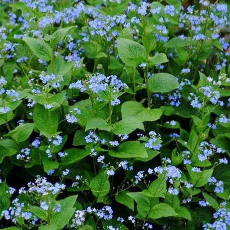 Бруннера крупнолистная (Brunnera macrophylla) — многолетний декоративный куст с крупными зелёными сердцевидными листьями, создающими плотный декоративный фон в саду. Ранней весной появляются нежные голубые цветки, напоминающие незабудки, придавая саду лёгкость и воздушность.