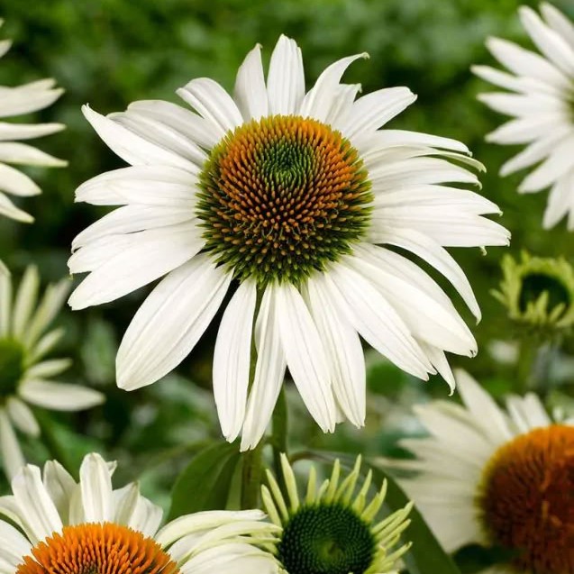 Эхинацея пурпурная "White" - многолетние, яркие растения второй половины лета. Высота 80 см. Соцветия-корзинки с оранжево-бронзовой, выпуклой серединой и язычковыми, слегка опущенными, цветками белого цвета. Цветёт с июля по сентябрь. Почвы проницаемые, нейтральные, без застоя влаги. Зимостойки при наличии дренажа. Засухоустойчиво. Под посадку отводят солнечное место. Высаживают на дальнем плане одиночно или небольшой группой. Гармонично в посадках с физостегией, гипсофилой, флоксами, лиатрисом, монардой, дербенником, злаками, флоксами, шалфеем. Декоративна в срезке. В зимних букетах используется отцветшие шишки-семенники. Выращивают также в лечебных целях. Популярны в садах природного стиля, в миксбордерах. Расстояние между растениями 30–35 см. Норма посадки 7-9 шт./м².