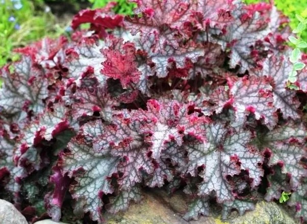 Гейхера 'Can Can' - листья серебристые с тёмно-зелёными и бордовыми тонами, свекольные с изнанки. Молодые листочки бруснично-розовые. Край листа ажурный, сильно волнистый. Цветочки мелкие кремовые, источают несильный, но приятный аромат. Цветение длится с середины июня до середины августа. Знаменитый сорт, обладатель множества международных наград. Солнце, полутень. Неприхотлив, не переносит замокания и тяжелых почв. Высота 35 см, диаметр 40 см, цветоносы 60 см. Сочетается с растениями с вариегатными листьями, например, молинией голубой сорта вариегата, овсяницей голубой. Также с полынью, ясноткой, стахисом. Расстояние между растениями при посадке 25-30 см. Подходит для оформления цветочных бордюров и цветников. Рекомендуется периодическое окучивание растения. Норма посадки на 1 кв м 10 шт.