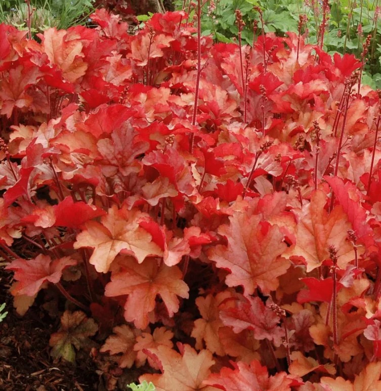 Гейхера «Паприка» — компактный многолетник с декоративной листвой: листья от ярко‑оранжевых до кораллово‑красных, с эффектом «паприки», образуют плотный кустик. Высота растения около 20–30 см, ширина — 30–40 см. Цветёт в конце весны — начале лета небольшими белыми колокольчиками, поднимающимися над листвой.
