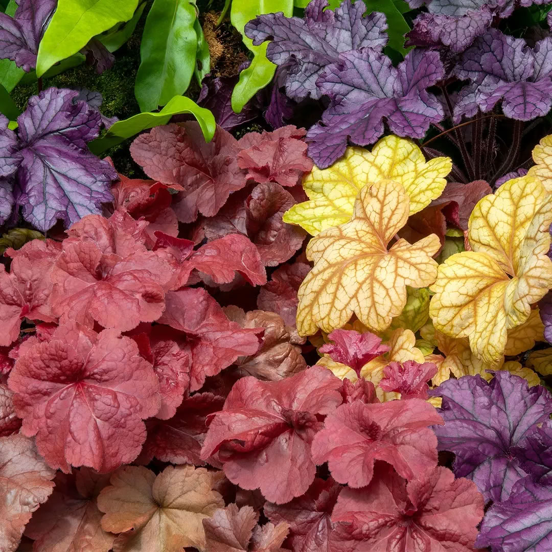 Гейхера микс — очаровательная коллекция декоративно-лиственных многолетников, в которой каждый куст словно произведение искусства. Бархатистые листья окрашены в фантастические сочетания зелёного, бордового, медного, серебристого и пурпурного оттенков, образуя живой ковер, меняющийся от весны до осени. Высота растений около 25–40 см, ширина куртины до 50 см. В середине лета над листвой поднимаются изящные цветоносы с мелкими кремовыми или розоватыми колокольчатыми цветками.