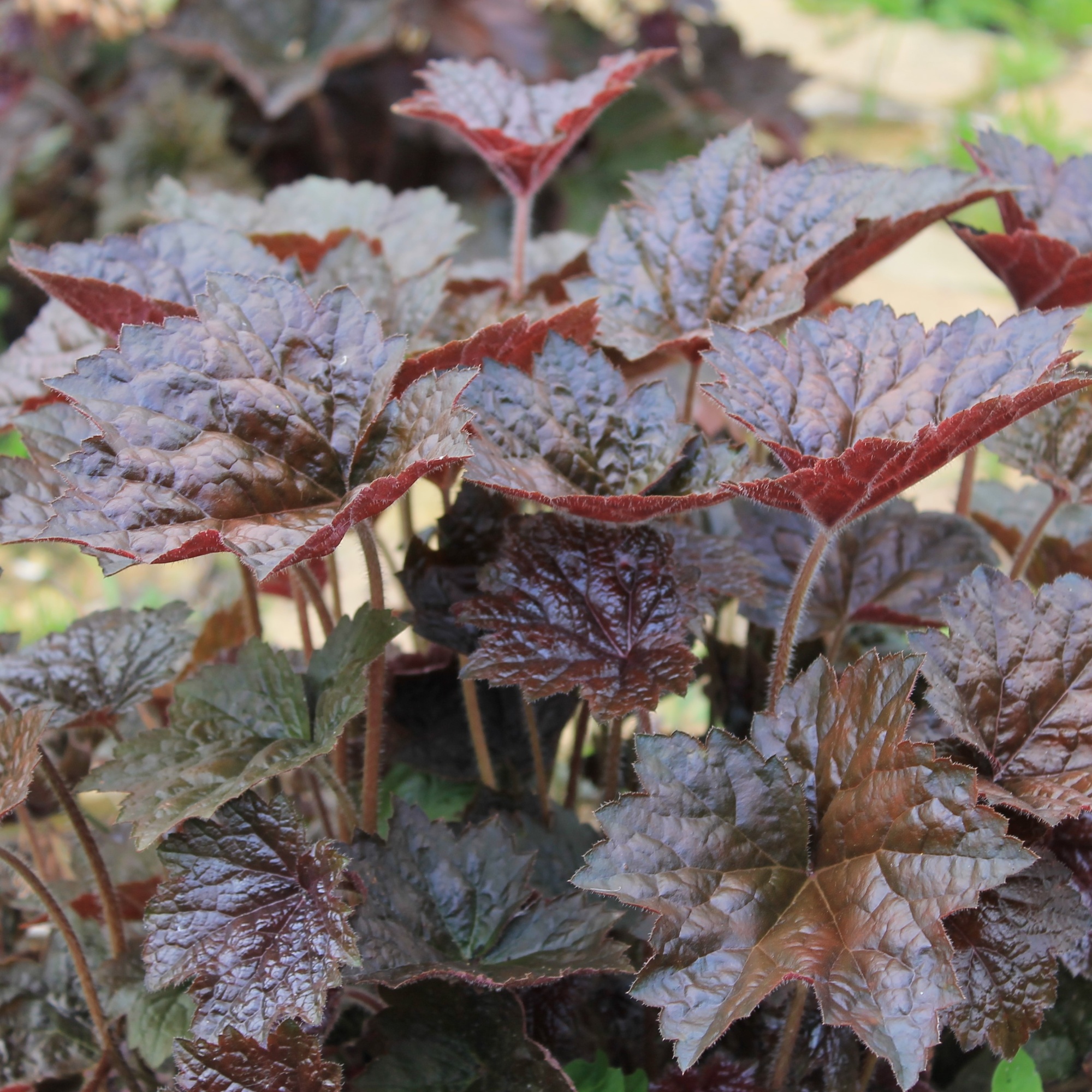 Гейхера "Пурпурный дворец" - многолетник, считается самым неприхотливым сортом среди пурпурных гейхер, с бронзово-бордовой листвой. Высотой 20–25 см /диаметр 45 см. Цветёт в июне-августе кремовыми соцветиями, цветоносы 60 см. Используют на клумбах, рабатках, в рокариях, в композициях, например, с можжевельниками, спиреями. Предпочитает дренированные почвы. Светолюбива, но выносит полутень. Рекомендуется периодическое окучивание растения. Норма посадки 8-10 шт./м².