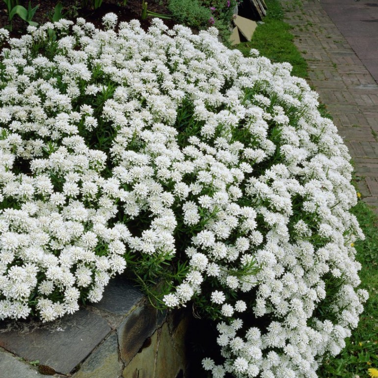 Иберис вечнозеленый - низкорослый кустарник, покрытый белоснежными соцветиями, высотой 30 см. Цветение начинается в конце весны и продолжается около 2-х месяцев. Приятный аромат цветов. Зеленые гладкие ланцетные листья. Предпочитает супесчаные, дренированные, нейтральные, слабощелочные почвы. Солнечные места. Используется для альпийских горок, рокариев. В качестве бордюрных посадок с маргаритками, злаками, колокольчиками. После цветения рекомендуется подстричь кустик, придав аккуратную форму. Норма посадки 8-10 шт./м².