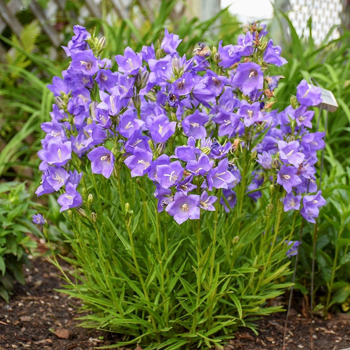 Колокольчик персиколи́стный Takion Blue - многолетнее растение (малолетник), высотой 50 см, диаметр около 30–40 см. Цветки ширококолокольчатые светло-сиреневые с фиолетовым отблеском, цветет в начале лета. Особенность сорта в направленности, открытости к зрителю (не поникающие цветки). Неприхотлив в уходе. Предпочитает открытые места или полутенистые с рыхлой влажной почвой. Подходят для переднего или среднего плана клумб и миксбордеров. При создании цветников сочетается с флоксами, вероникой, злаками, дельфиниумом, ромашками. Количество при посадке 9–10 шт./м².