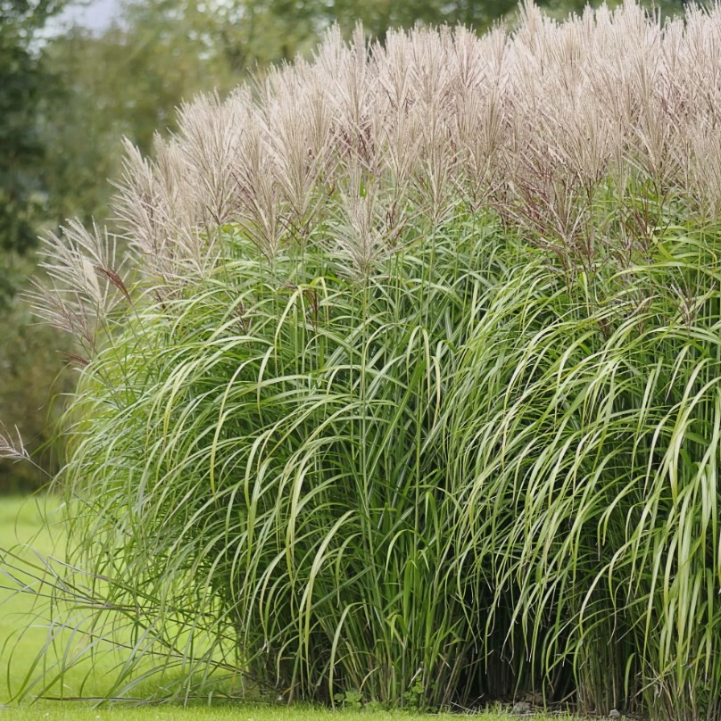 Мискантус китайский ‘Grosse Fontaine’ — высокий декоративный злак, достигающий 2–2,5 м в высоту, с дугообразными листьями и крупными серебристо-розовыми метёлками, которые появляются в конце лета и сохраняют декоративность до осени.