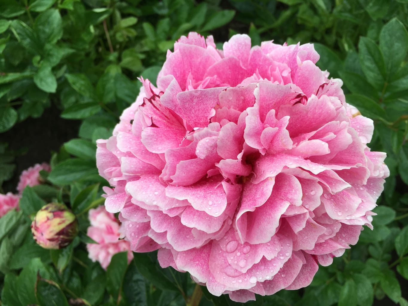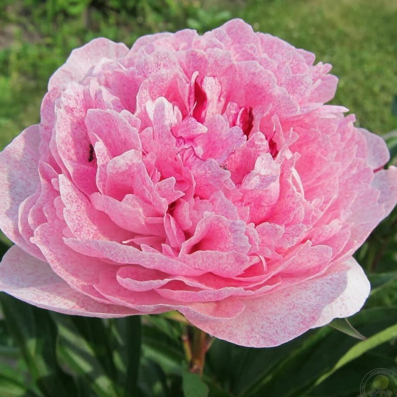 Пион The Fawn — утончённый сорт, известный своим необычным мраморным узором. На фоне нежно-розовых лепестков словно рассыпаны крошечные пурпурные точки, придающие цветку особую глубину и живость. Бутоны крупные, густомахровые, с мягким ароматом, раскрываются плавно, сохраняя форму даже под дождём. На солнце лепестки слегка мерцают, создавая ощущение воздушного кружева.