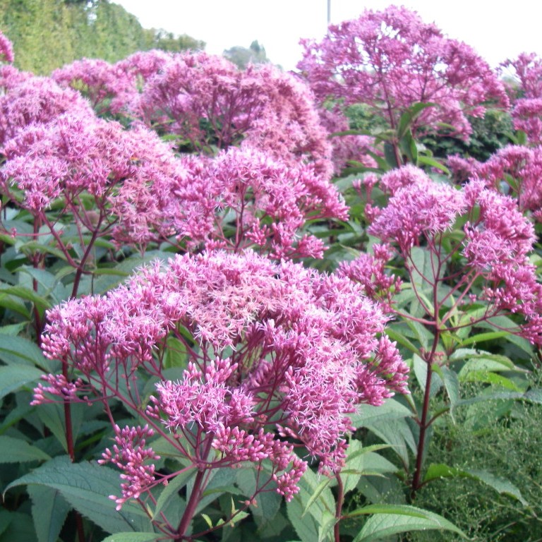 Посконник пятнистый "Atropurpureum" - многолетнее растение. Предпочитает солнечные участки, но выдерживает частичное затенение. Любит влажные, щелочные почвы. Наиболее декоративен в конце лета и осенью. Высота до 1,8 м, ширина до 1,2 м. Стоит подыскать место в задних рядах большого бордюра для этой культурной более красочной формы выносливого дикорастущего вида. Листья темно-зеленые, стебли яркие, пурпурные. Пышные шапки розовых соцветий составляют выигрышные сочетания с аконитом, горцем, эхинацеей, которым более всего подходят те же условия. Оттенок цветков постепенно блекнет, становясь серебристо-коричневым, но и тогда они неплохо смотрятся до глубокой осени. Норма посадки 2-3 шт./м².