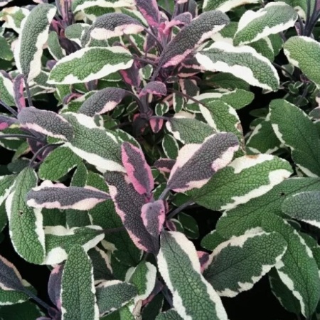 Шалфей лекарственный Триколор — это изысканное растение, которое сочетает в себе декоративность и целебные свойства. Его листья окрашены в три оттенка — зелёный, кремово-белый и пурпурный, создавая яркий узор, который оживляет любой уголок сада.