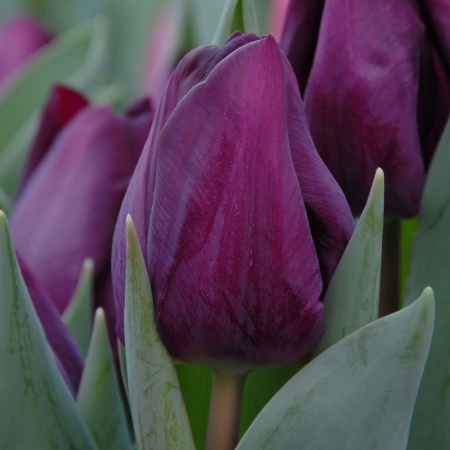 Тюльпан Purple Lady — тёмно‑фиолетовые бокалы раскрываются на прочных стеблях 45–50 см, добавляя глубину и контраст среди весенней зелени.