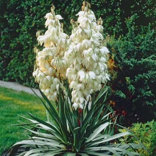 Юкка нитчатая - необычное многолетнее растение. Вечнозеленое растение с колокольчатыми цветами и нитевидными отростками. Требуется укрытие на зиму. Плотные листовые розетки. Листья острые, мечевидной формы, длиной 60 см. По краю листьев ниспадают длинные тонкие волокна. Цветы кремово-золотистого окраса, конусовидная форма соцветия. Первые бутончики могут наблюдаться на 2-3 год жизни. Цветочная метелка всходит в июле. Продолжительность цветения – около трех недель. Выбирать место под посадку следует на солнце, защищённое от ветра и без застоя воды. Легкая, воздухопроницаемая и не очень богатая органикой почва.