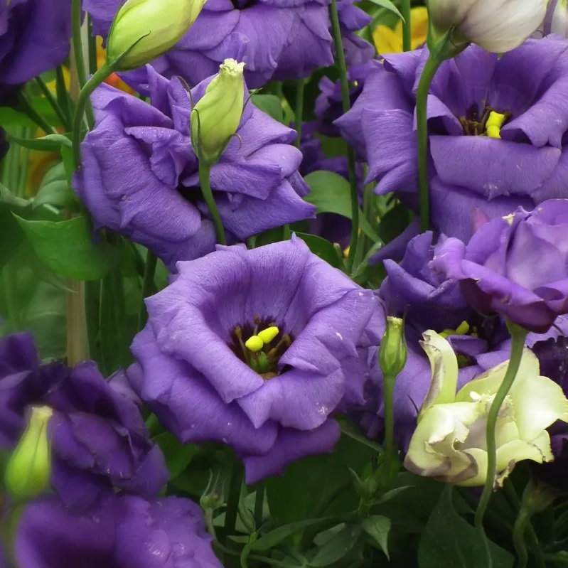 Эустома — эффектный однолетник с крупными чашевидными цветками диаметром 5–8 см, окраска которых варьируется от белой и розовой до фиолетовой и лавандовой, часто с контрастной каймой. Высота растения достигает 30–50 см, ширина куста — 20–40 см, что позволяет использовать его как в бордюрах, так и в контейнерных композициях.