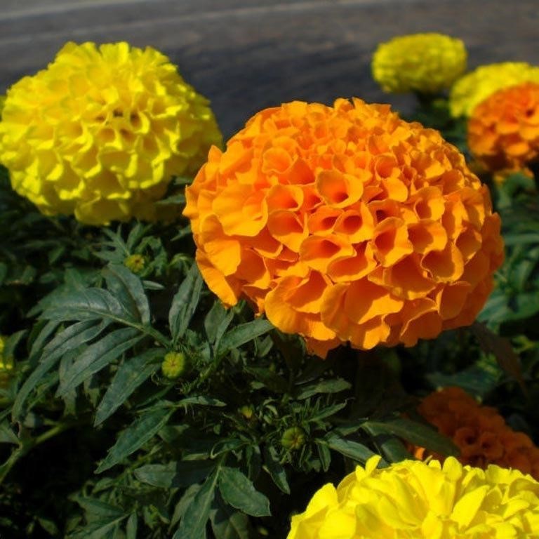 Тагетес прямостоячий - (жёлтый, оранжевый, микс) однолетнее прямостоячее растение. Высота: до 40 см. Диаметр куста: 30-40 см. Цветки: сливочно-белого цвета, крупные густомахровые диаметром 8 см. Растение теплолюбивое, поэтому в открытый грунт рассаду высаживают в конце мая – начале июня, с расстоянием между растениями для высокорослых сортов 50 см, для низкорослых – 20 см. Тагетес теневынослив, но лучше развивается на хорошо освещенных местах и нетяжелых, достаточно увлажненных почвах. Можно использовать в качестве комнатного растения или украшения балкона, лоджии.