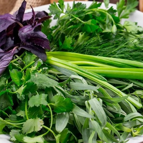 Овощной микс — смесь популярных зелёных растений, таких как петрушка, укроп, руккола зелёный лук, базилик и другие ароматные травы. Микс создаёт разнообразие вкусов и текстур, идеально подходит для свежих салатов, приправ, гарниров, соусов и кулинарных экспериментов.