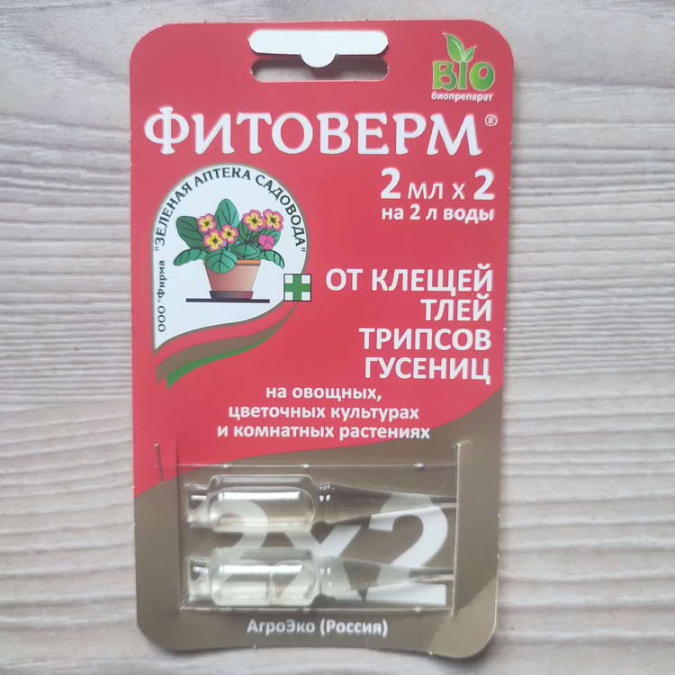 Фитоверм, КЭ – инсектоакарицид биологического происхождения. Действующее вещество препарата является продуктом жизнедеятельности почвенных микроорганизмов и влияет на нервную систему насекомых, вызывая паралич и гибель. Вредители перестают питаться чрез 6-8 часов после обработки. Погибают через 3-6 дней. Последействие препарата – до 20 дней. Препарат Фитоверм подходит для экологического земледелия.