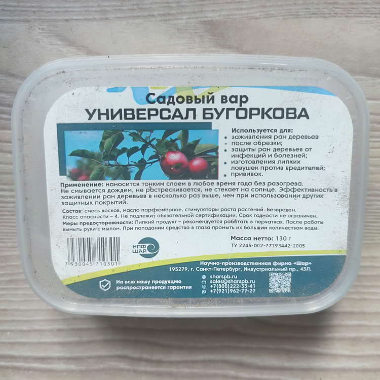 СПОСОБ ПРИМЕНЕНИЯ: садовый вар наносят лопаткой на свежие предварительно продезинфицированные медным купоросом срезы, или на застаревшие повреждения, предварительно очистив их от омертвевших частей до здоровой древесины. При обработке глубоких ран в размягченный садовый вар рекомендуется как наполнитель добавить мел или доломит.